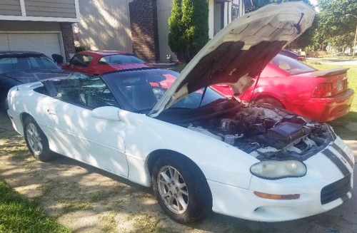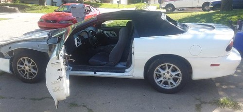 White Chevy Camaro '98 for $1500 by owner in KS 66106. Vehicle runs and drives good. It was my daily driver. It has a misfire but I put 5 plugs and 4 wires. It has a new alternator and belt tensioner and coils with a touch screen radio and neon lights underneath it has 2 extra doors it has new front struts rear shock absorbers new fuel filter and it has the one new spark plug and the two new wires the back window was knocked out but no cracks and has defroster just put plexiglass in it. Asking $1500 or BEST OFFER. Cash only.