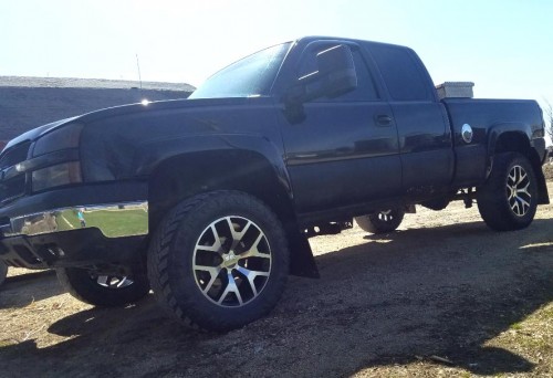 Lifted truck with extended cab for $5k in Iowa. This black 2003 Chevy Silverado 1500 LT comes with a 6-inch lift kit, 20-inch rims, 35-inch tires, cowl hood, tow mirrors, toolbox, 7-inch touchscreen radio, new kicker subwoofers, cold air intake, new brakes and rotors 1000 miles ago, dark tinted windows, windows wind deflectors, metallic toolbox in bed, dual exhaust, towing package, dual climate control, seating capacity for up to 6 people, etc. Truck runs and drives strong, just has little rust, ask about popout in bedside, cloth interior, good clean condition, make me an offer!