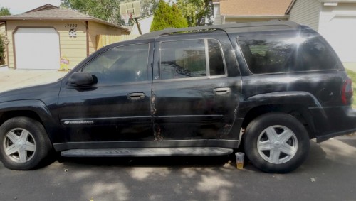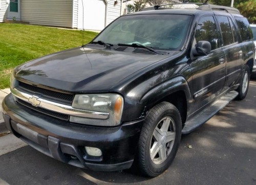 Repairable black Chevy Trailblazer LT 2003 under $1500 in Colorado 80013. The SUV isn't running. Has new battery, serpentine belt brakes, stereo with backup camera, subwoofer/amp wipers, dark tinted windows, running boards, fog lights, front tow hooks, trailer hitch, roof rails, gray cloth interior. Good deal if you know how to work on cars.