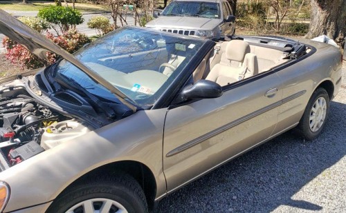 Garage kept convertible with low miles. This gold Chrysler Sebring 2003 belongs to a pet/smoke-free owner, it has a new convertible top, car no mechanical issues, comes with anti-theft system, alloy wheels, fully automatic, beige convertible top, great and clean beige cloth interior, only 101k miles.