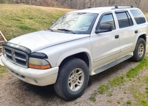 Had replaced the radiator, alternator, tire rods, and runs really well, the four-wheel drive works great, has 4 brand-new tires, roof rails, running boards, windows rain guards, grill bugs deflector, tinted windows, all power options. This is a 4x4 SUV Dodge Durango SLT 2003 white exterior for less than $3K in Blaine 37709.