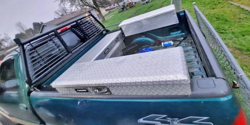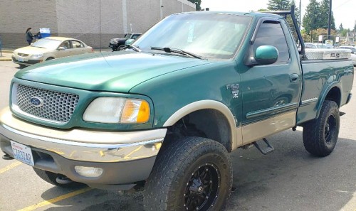 Lifted truck under $5K Ford F150 XLT 1999 by owner in Tacoma-Washington, loaded with the 4.6L engine, excellent for work. Used to do construction and remodeling, now I'm working in a factory job and bought an SUV to save gas. Selling this green truck for $4500 or BEST OFFER. It runs and drives great. It has no tranny issues or slippage, etc. Well maintained, oil change has been done every 3K miles. It has new shocks in the front. I have new shocks in the metallic toolbox for the back. It comes with 3 toolboxes mounted and secured along with the keys to them. The majority of the front-end suspension is new, including CV axles, ball joints, new rotors, and brakes and replaced 3 of 4 calipers. Also, has new fuel injectors, new coil packs, new EGR valve, new spark plugs. Got a lot of new shit in it, the air filter also changed not too long ago and rear differential fluid changed as well. Has lift kit, black rims, wide tires, towing package, fog lamps, tan cloth interior, tinted windows, windows wind deflectors, aftermarket stereo, etc.