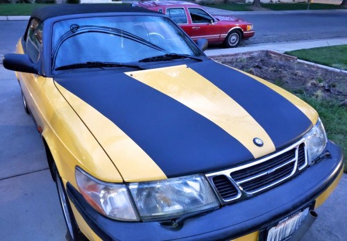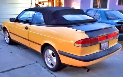 Yellow Saab Talladega SE Tour with black strips. Top only works manually, needs front end work and tags are overdue, other than that, good convertible for only $1500